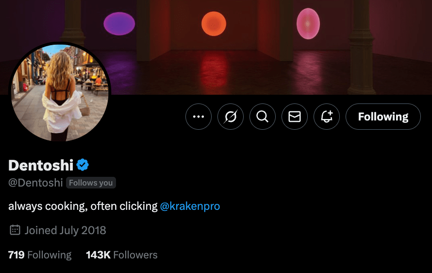Dentoshi 非常注重心理卫生。她会记录交易记录(理想情况下每周 2-3 次),制定清晰的入场/出场规则,并通过关注精心挑选的资深交易员来屏蔽推特上的噪音。