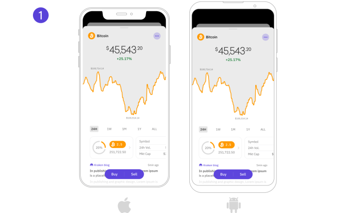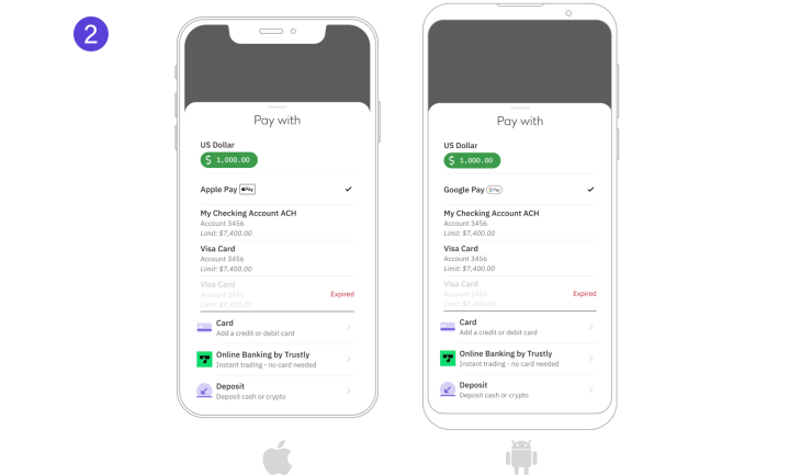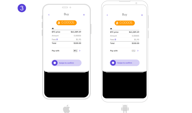 Kraken App(可在Apple App Store或Google Play Store下载)将自动连接到您现有的 Apple Pay 或 Google Pay 账户。之后,只需三个简单的步骤即可完成加密货币购买。