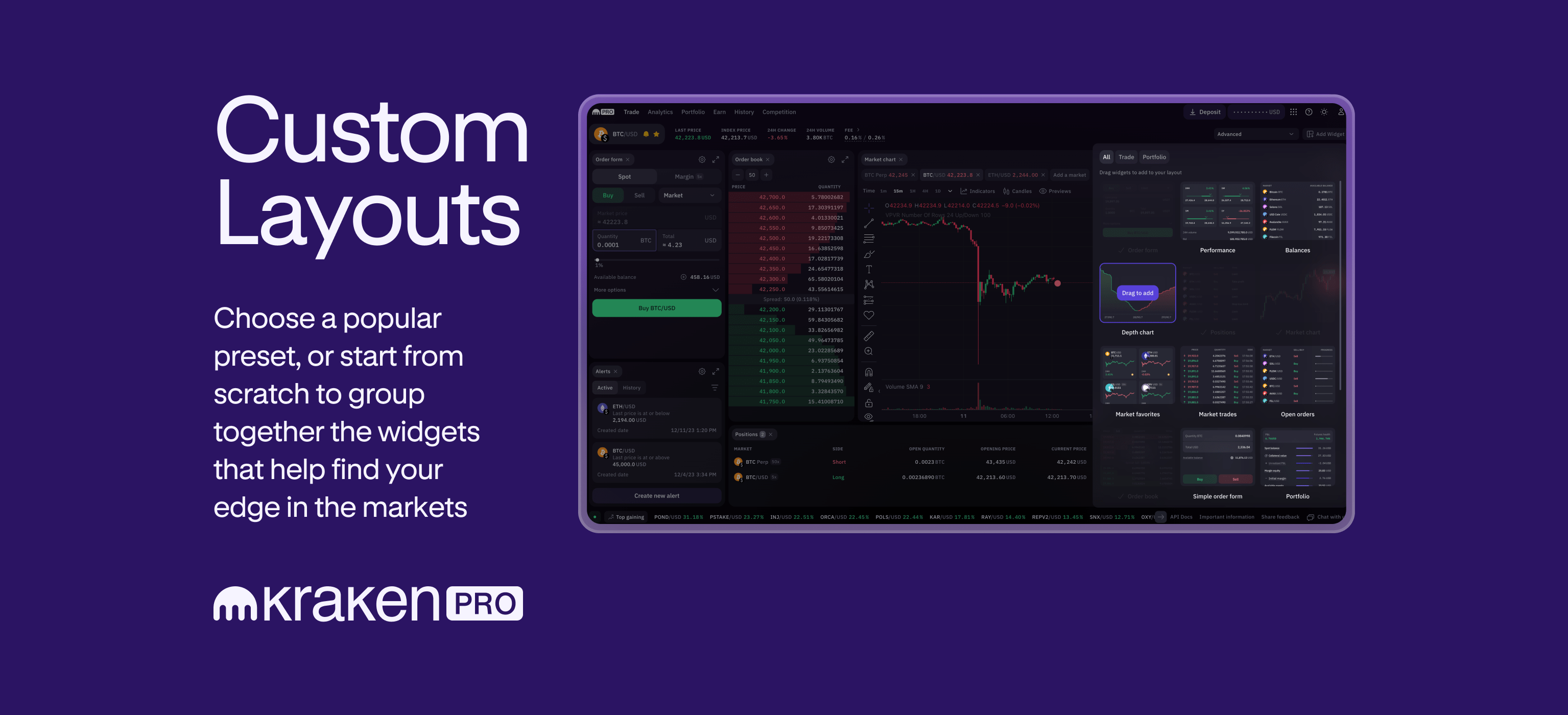 使用 Kraken Pro 上的自定义布局,通过预设或适合您个人交易风格的独特配置来定制您的交易界面。