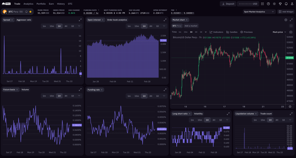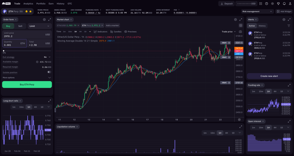 将清算量和多空比率小部件与资金费率和未平仓合约相结合,客户可以更有效地评估市场风险和杠杆头寸。将这些功能与价格警报和订单簿功能结合使用,可以密切关注您的交易和市场状况。