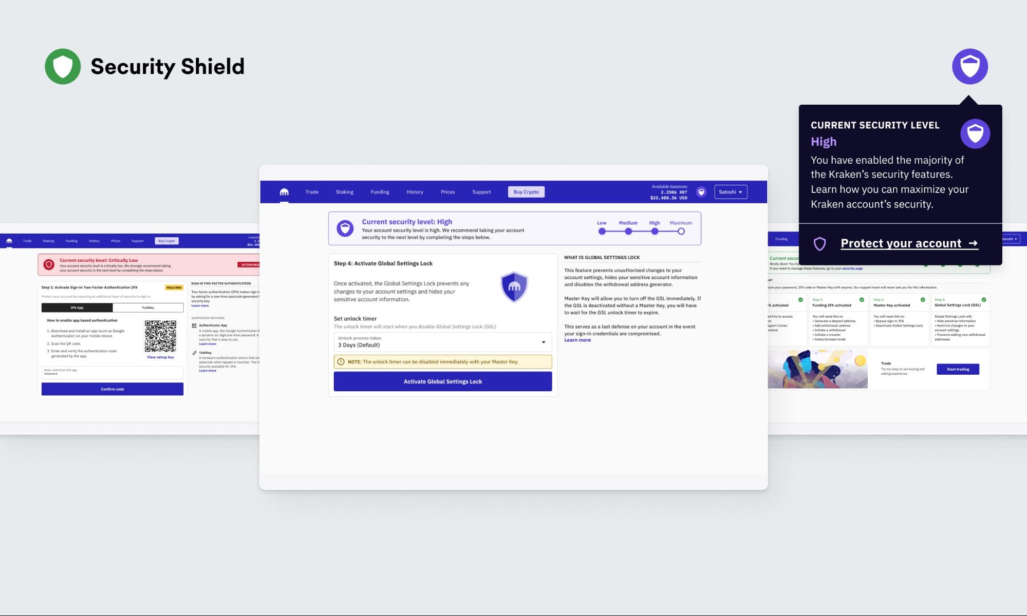 下次登录 Kraken 时,您会在屏幕右上角看到一个小盾牌。它会指示您账户的安全状态,并提示您采取措施。闪烁的红色代表最低安全级别,稳定的绿色代表最佳安全级别。当然,选择绿色!