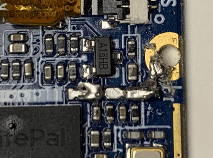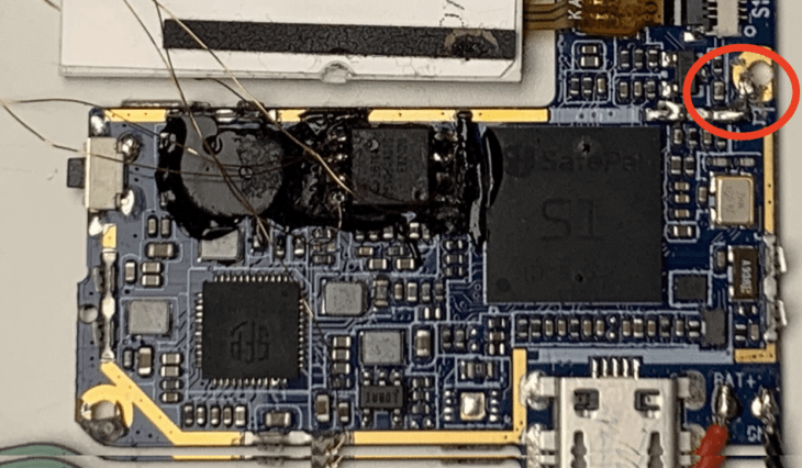 SafePal 的射频屏蔽罩已被移除。负责检测射频屏蔽罩移除的触点通过一小段导线接地。