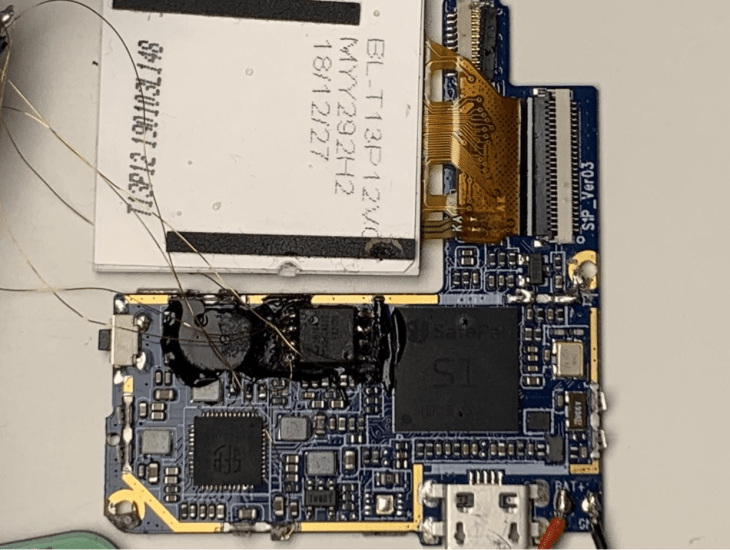 SafePal 的射频屏蔽罩已被移除,闪存芯片上的封装层也被刮掉了。