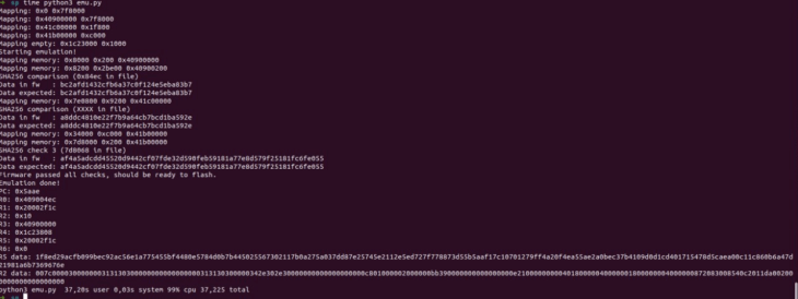 模拟第一阶段引导加载程序,包括检查固件检查,从而允许测试修改后的固件以确定其是否能通过检查。
