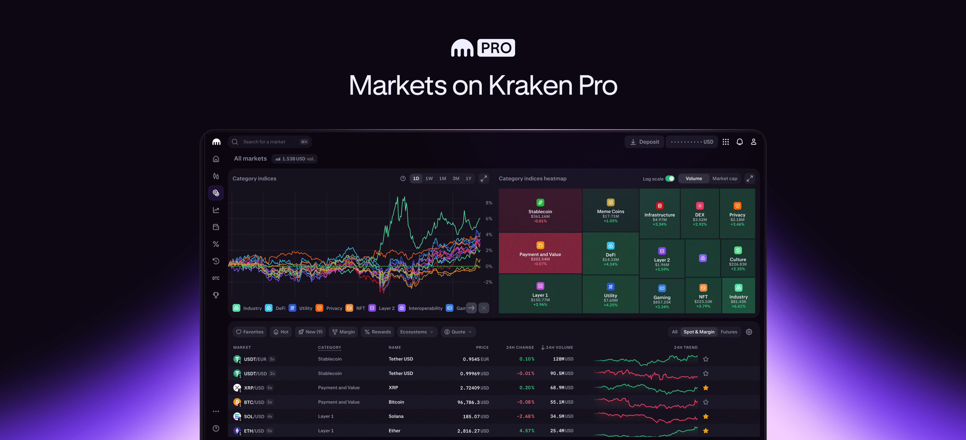 加密货币市场瞬息万变,您的分析工具也应与时俱进。我们全新的“市场”选项卡旨在帮助您简化复杂流程,发掘潜在价值,并更快地把握投资良机。深入分析行业概况,一目了然地查看市场表现,并在 Kraken Pro 中无缝执行交易。