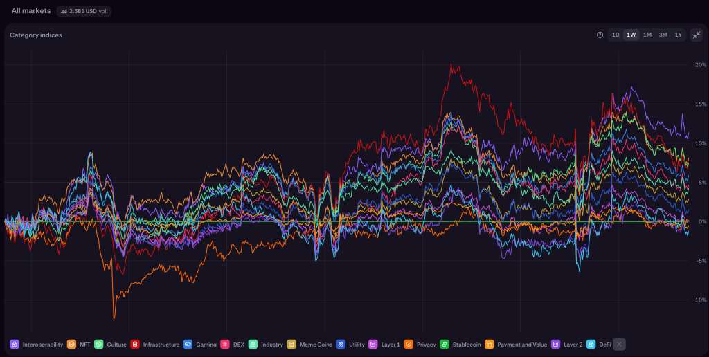 类别指数热图:可视化每个类别指数(例如,DeFi、Layer 2、支付与价值等)相对于其他类别指数的表现。