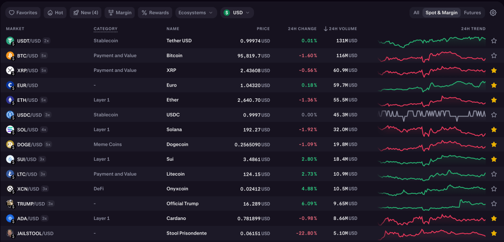 按报价货币(美元、欧元、比特币等)、代币生态系统(例如以太坊、Cosmos、Solana)甚至“热门”市场(过去 24 小时内交易量变化百分比最高的市场) 进行筛选