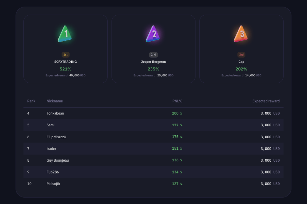 展现你的交易技巧,赢取巨额奖金。高达10万美元!时机已到——我们为期30天的期货交易大赛正式启动!展现您的期货交易技巧,赢取10万美元奖金池的一部分。比赛报名现已截止。比赛何时举行?本次比赛将持续到2023年11月28日。您可以在比赛页面上查看剩余时间。准备好进军市场了吗?以下是您需要了解的一切:本次比赛的总奖金高达10万美元,等待着最优秀的交易员们。30 天比赛结束后,按盈亏百分比排名前 10